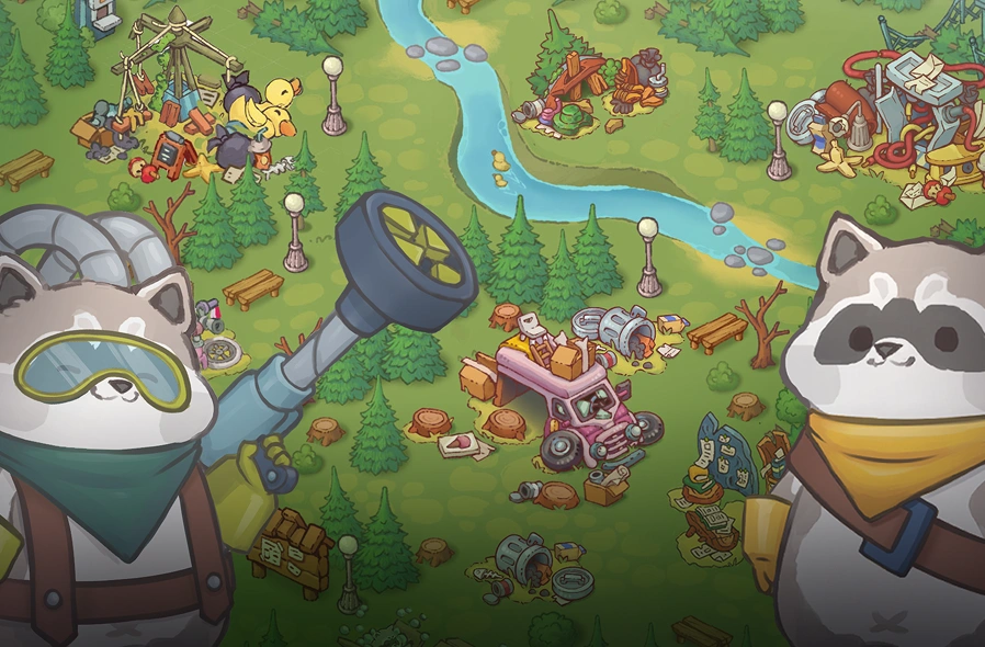In 2021 the studio stepped into more considered mobile territory: Candy Merge and Raccoon Tycoon. Then the war hit, and internal development paused for a few years.