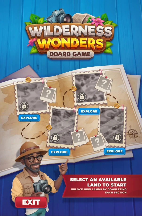Our team handled the full visual development for this project. We designed a cast of adorable ‘Game Board Animals’, a cohesive, ‘travel-journal’ aesthetic, vibrant game locations, and an adventure explorer. By using a bright, saturated color palette and a ‘board game’ path mechanic, we ensured that the gameplay felt accessible and rewarding.